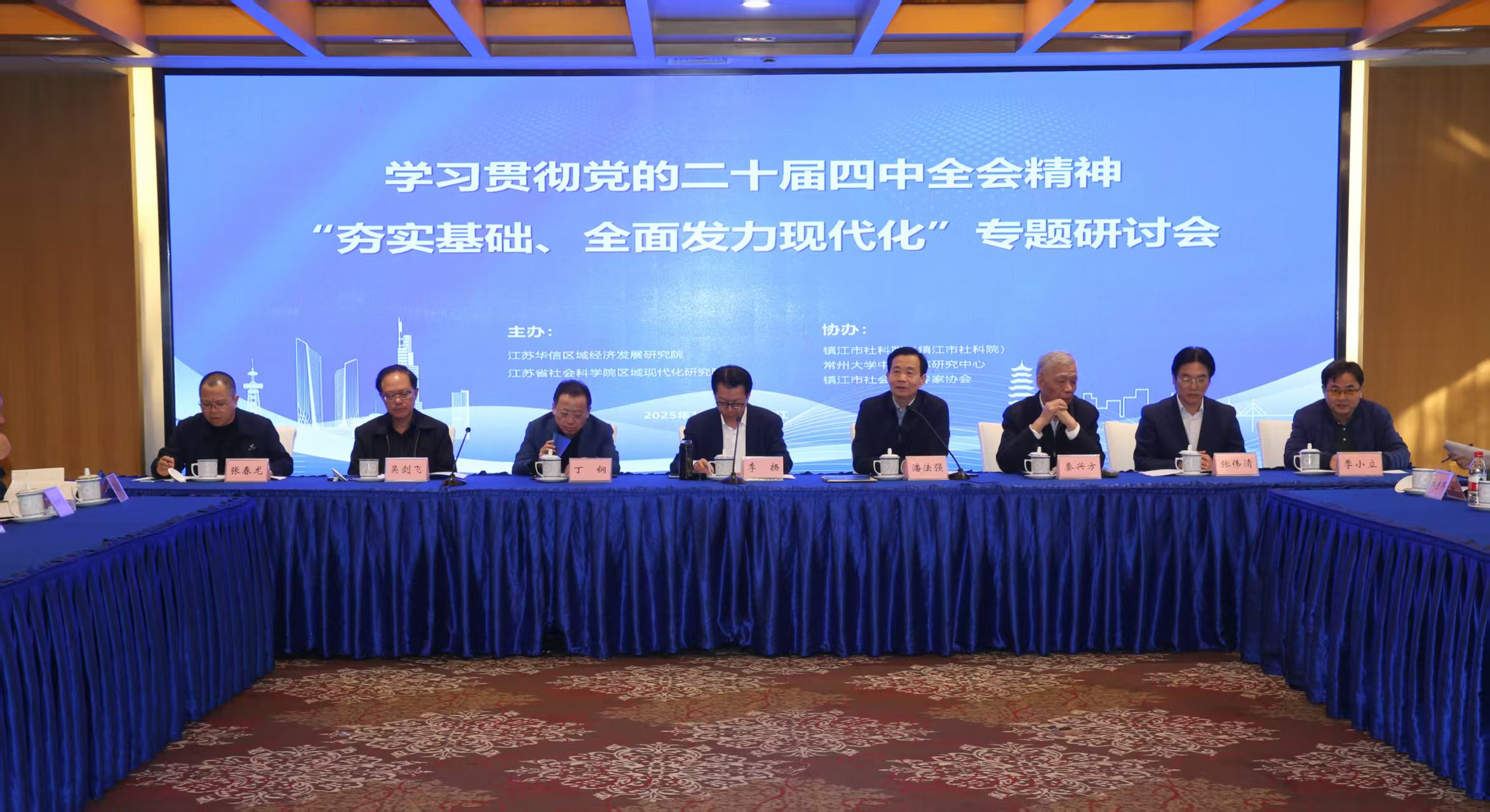 为深入学习贯彻党的二十届四中全会精神,精准对接“十五五”时期发展要求,为江苏在中国式现代化建设中走在前、做示范提供坚实智库支撑,11月14日,江苏区域现代化研究院与江苏华信区域经济发展研究院联合主办,常州大学中吴智库研究中心、镇江市社科联、镇江市社会科学专家协会等单位协办,在镇江召开学习党的二十届四中全会精神,“夯实基础、全面发力现代化”专题研讨会。来自省内科研院所、高等院校及社会其它各界的50多名社科理论界专家学者参加会议。