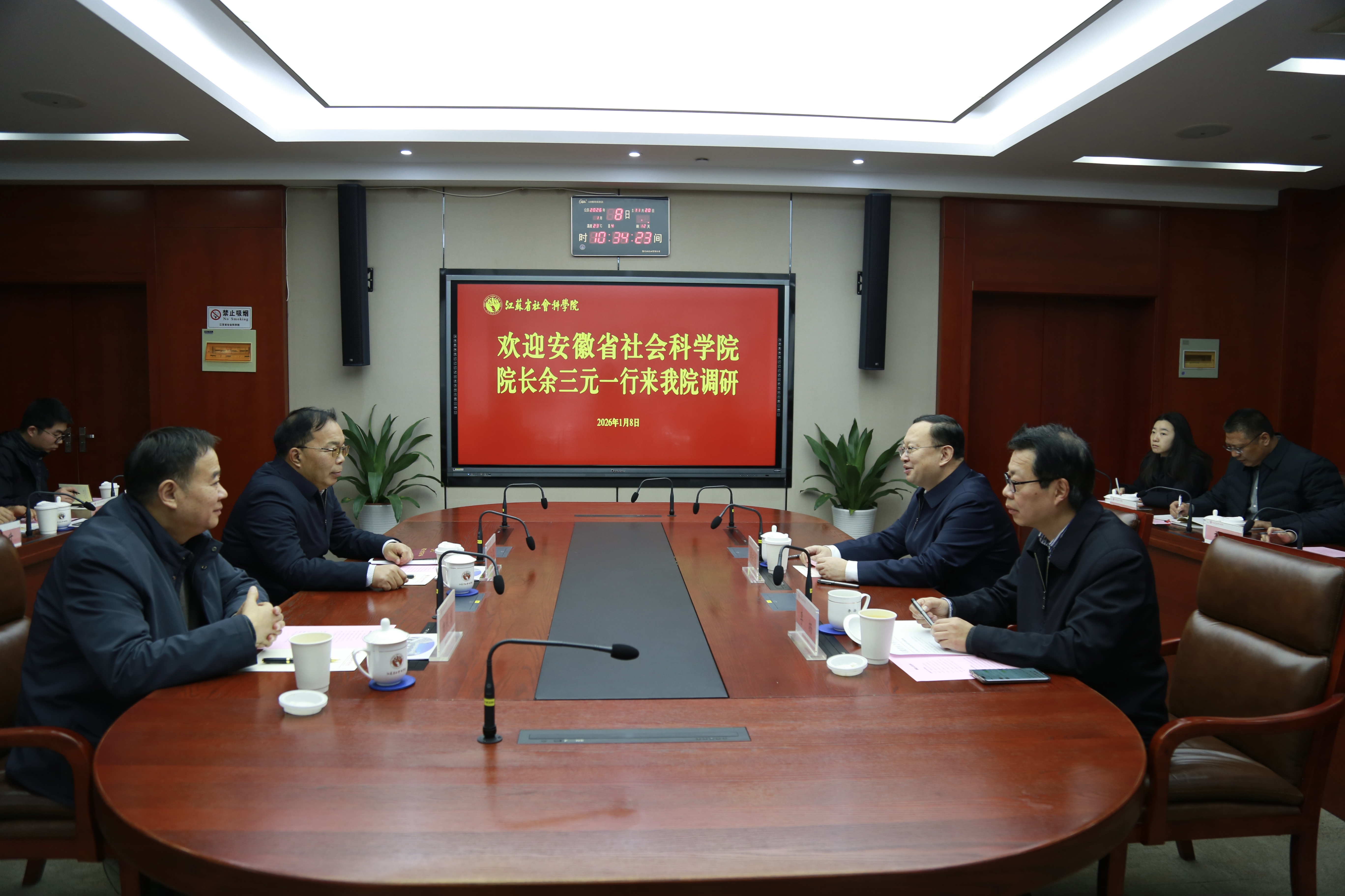 1月8日,安徽省社会科学院院长余三元、副院长杨俊龙一行来我院调研,党委书记、院长尚庆飞,党委委员、副院长李扬出席调研座谈会。